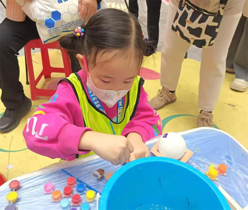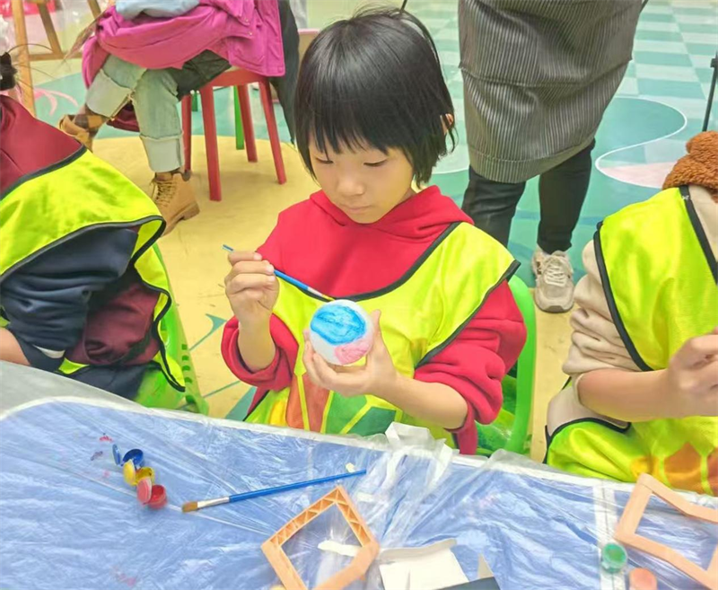 活动现场,社区工作人员提前到场维持秩序,老师提前备好星球灯底座、半透明灯罩、颜料、画笔等材料。随着老师的耐心讲解,孩子们立刻投入创作。有的家庭分工协作,家长扶稳灯罩,孩子细致勾勒环形山纹路;有的孩子大胆创新,在灯座上点缀闪粉,打造“发光星云”效果。当一个个独一无二的星球灯被点亮,柔和的光线透过创意图案洒出,孩子们兴奋地举起作品向同伴展示,家长们也纷纷用手机记录下这一温馨时刻。“能和孩子一起动手做手工,看着他认真的样子特别开心,这种活动特别有意义。”参与活动的家长李先生说道。