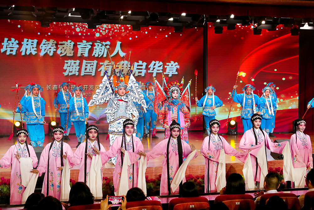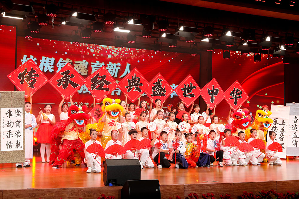 经开区中小学师生“培根铸魂育新人 强国有我启华章”艺术展演在舞蹈《华夏》中拉开帷幕。艺术展演分为“传道·冰心玉壶”“传习·明心见性”“传承·行则将至”三个篇章,充分展现了经开教育努力培养德智体美劳全面发展的社会主义建设者和接班人。