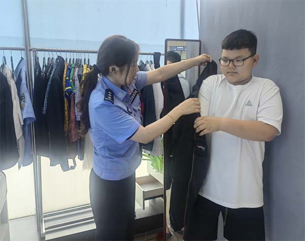 7月18日,就读中学的王同学来到政务大厅公安综合窗口办理身份证,由于白色T恤不符合要求,内勤带他来到衣架前,根据他体型及其需求,挑选了一件黑色西服,王同学的爸妈纷纷点赞,这服务太周到了。
