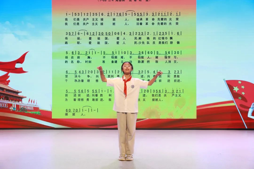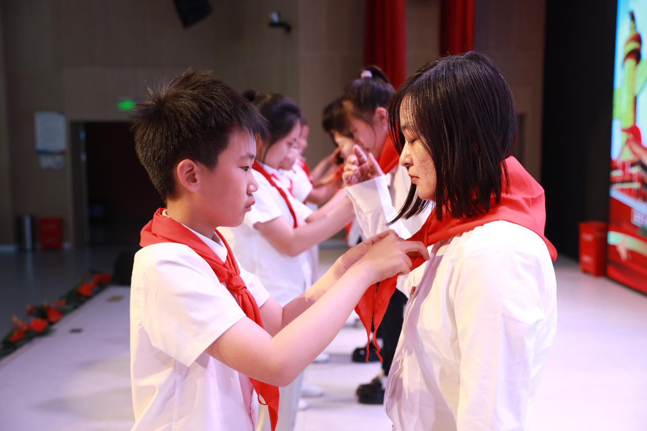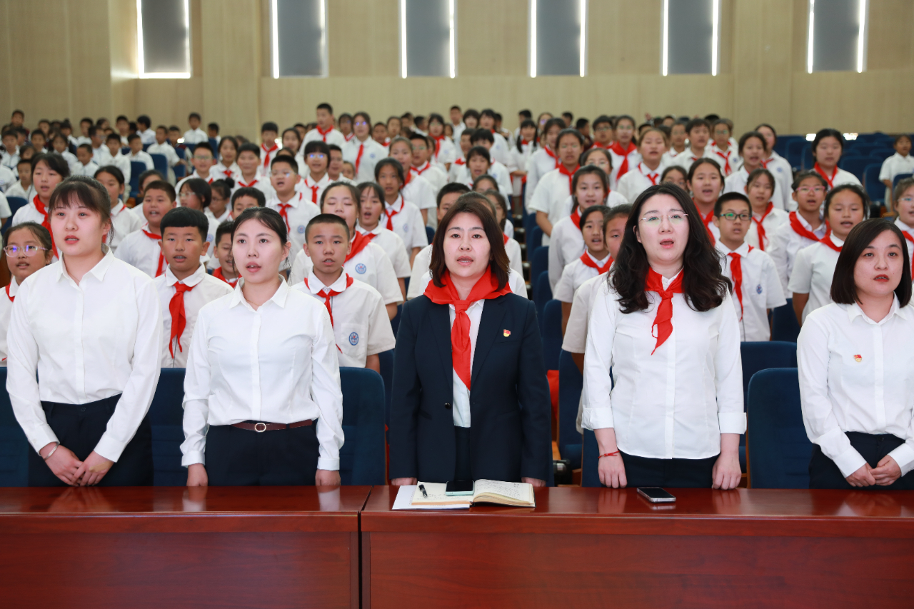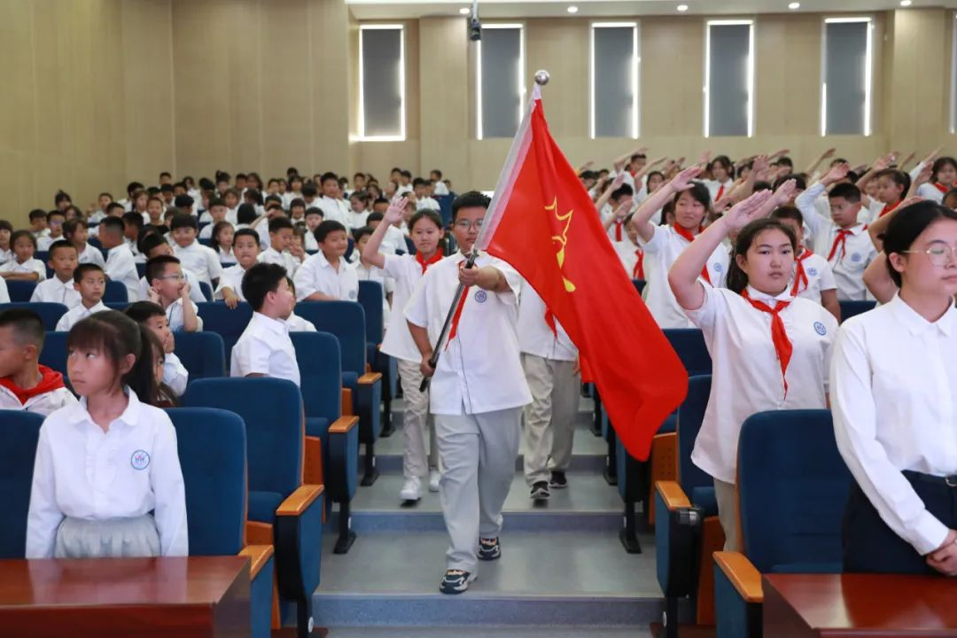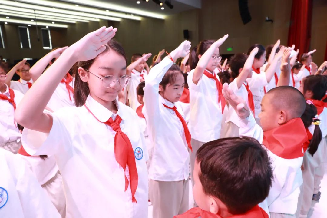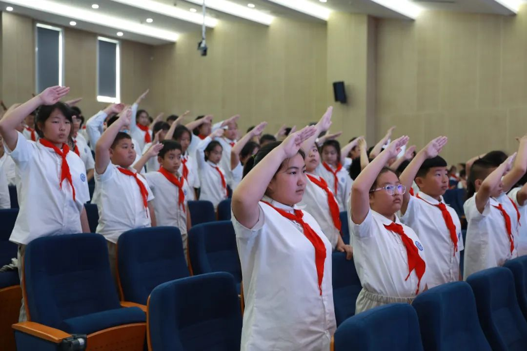 “我是中国少年先锋队队员,我在队旗下宣誓:我热爱中国共产党,热爱祖国……”新队员们在大队长张荣的带领下,高举右拳,庄严宣誓。他们的誓言铿锵有力、掷地有声,回荡在校园的每一个角落。这一刻,他们不仅成为了少先队员,更承担起了为共产主义事业而奋斗的崇高使命。