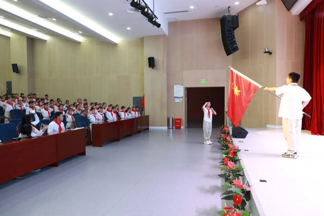 在庄严的大队旗下,全体队员紧握右拳,跟随大队辅导员陈宇老师进行呼号。他们的铿锵呼号展现了新时代少先队员的风采和担当。这一刻,他们立志为共产主义事业而奋斗终身的信念更加坚定。