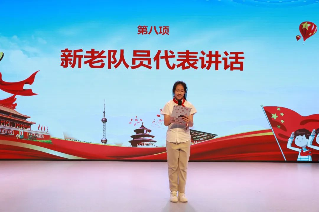 一(6)中队李溪桐代表新队员上台发言,她用稚嫩而坚定的声音表达了自己加入中国少年先锋队的喜悦与自豪之情。